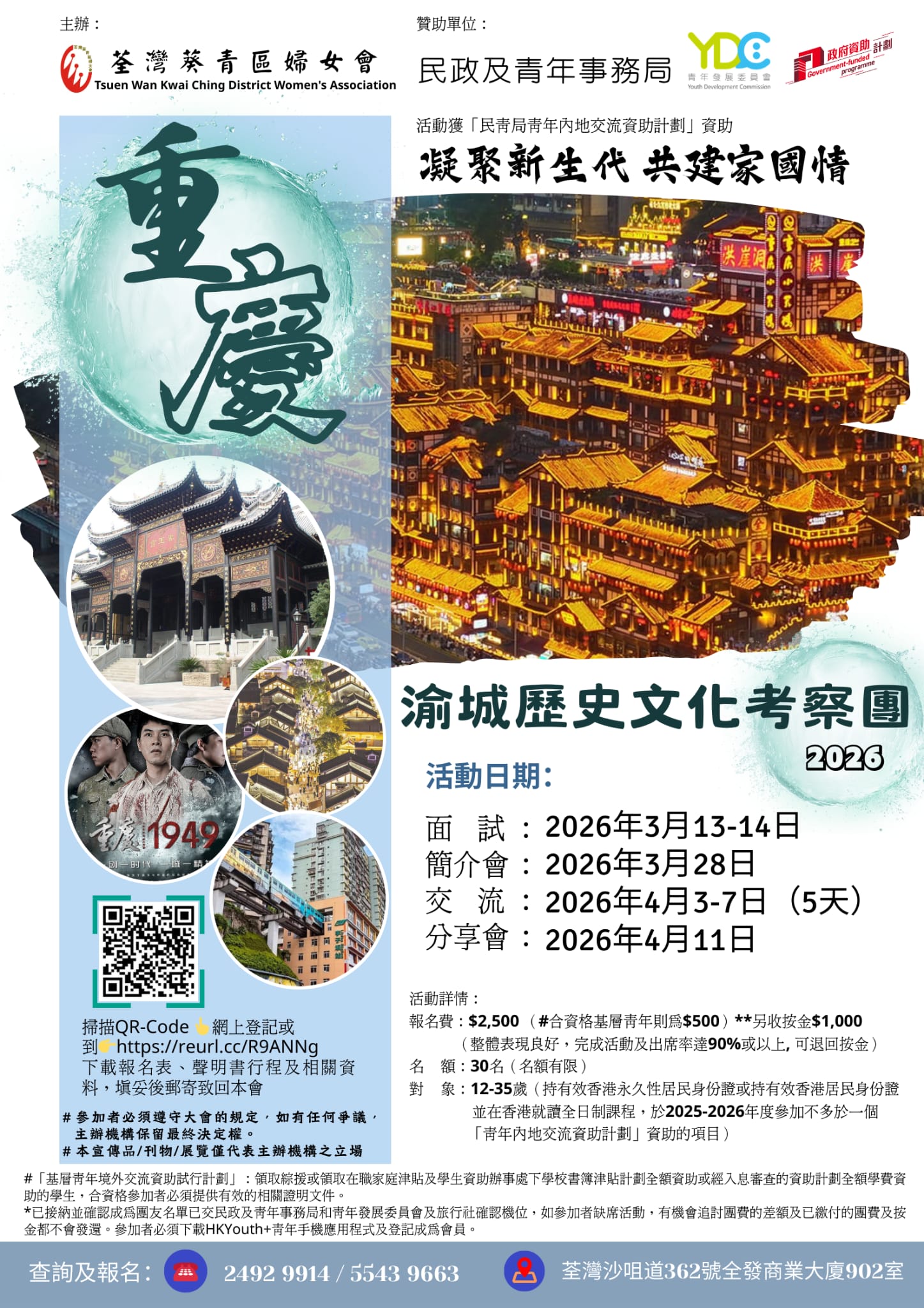 「渝城歷史文化5天考察團2026」以「凝聚新生代,共建家國情 」為主題,帶領30位香港青年學生深入了解重慶的歷史、巴渝文化及現代發展, 增強國民身份認同並拓寬視野,培育新生代正向的價值觀及責任心 。